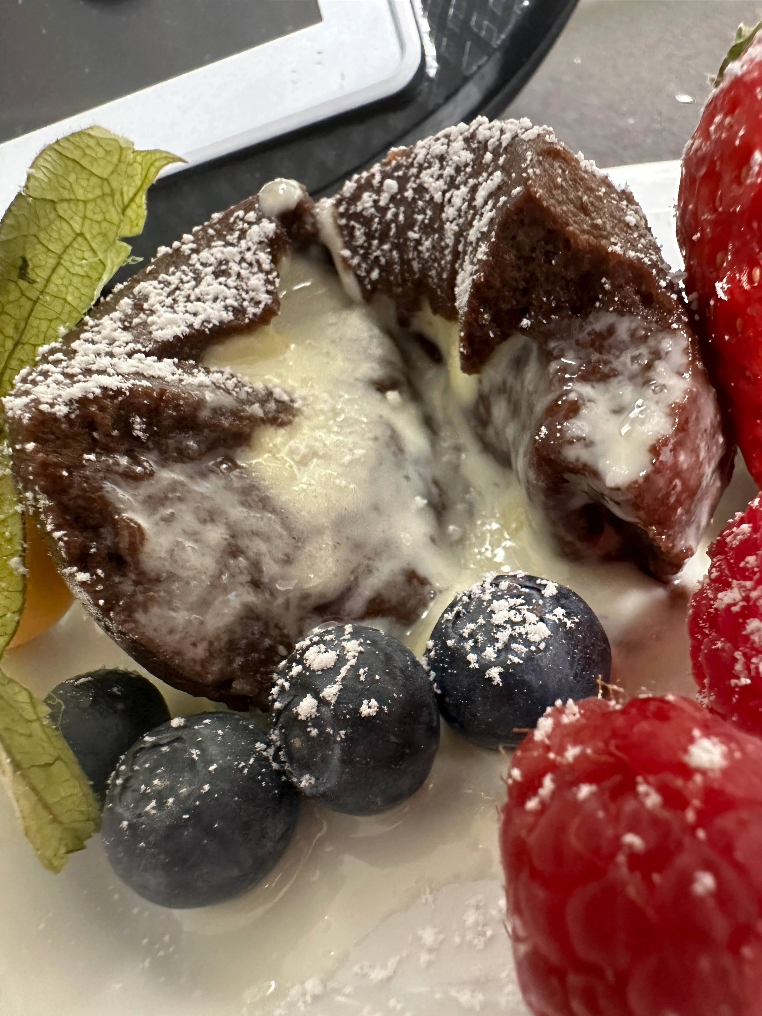 Wasser in den Mixtopf geben, Varoma aufsetzen, verschließen und für 20 Minuten auf Varoma Stufe 1 Dampf-garen. Varoma absetzen, Deckel vorsichtig abnehmen, so dass kein Wasser vom Deckel auf die Kuchen tropft. Die Förmchen vorsichtig (sehr heiß!) aus dem Varoma nehmen. Nach Wunsch mit Schlagobers und frischen Beeren dekorieren und servieren.