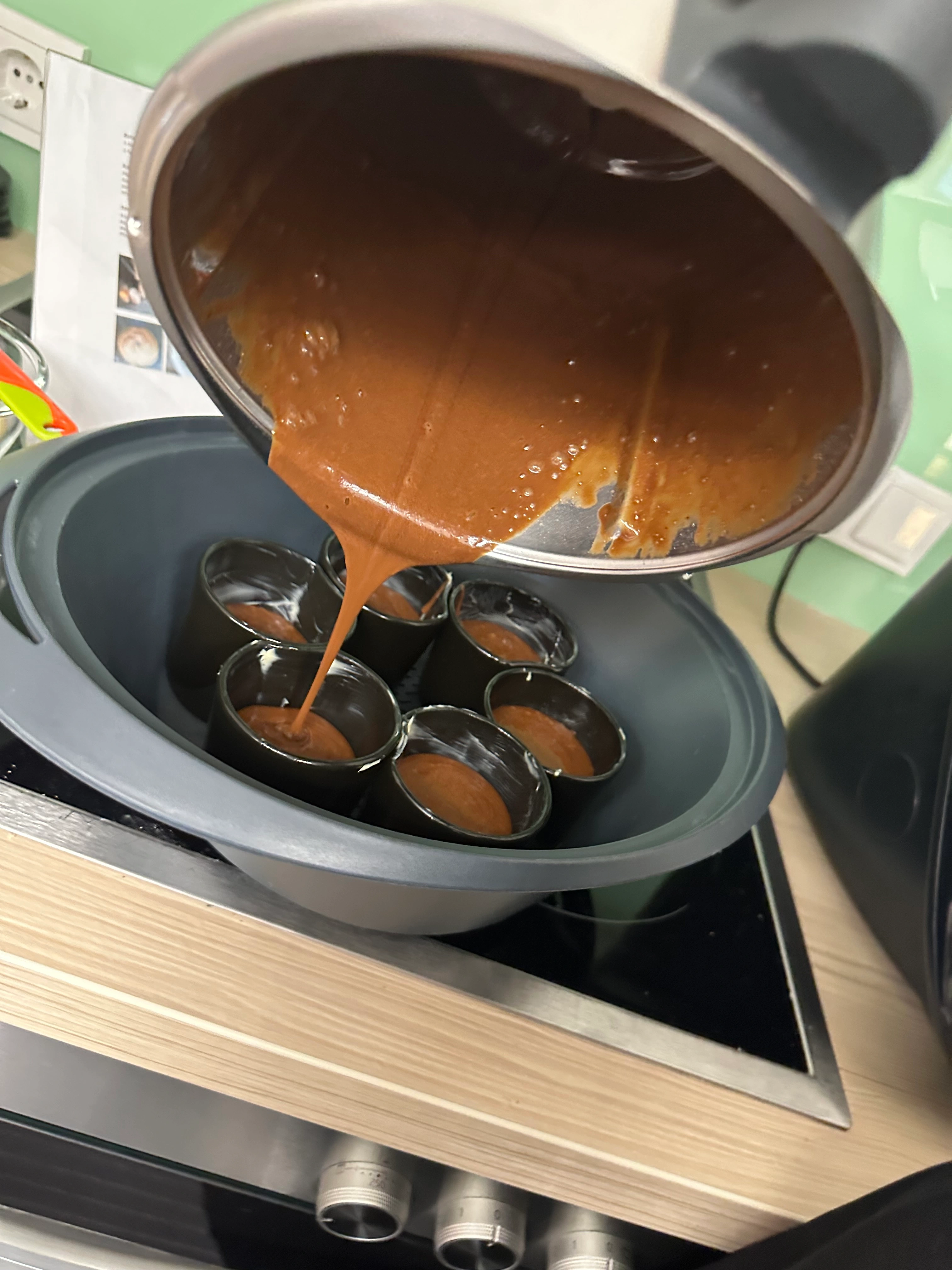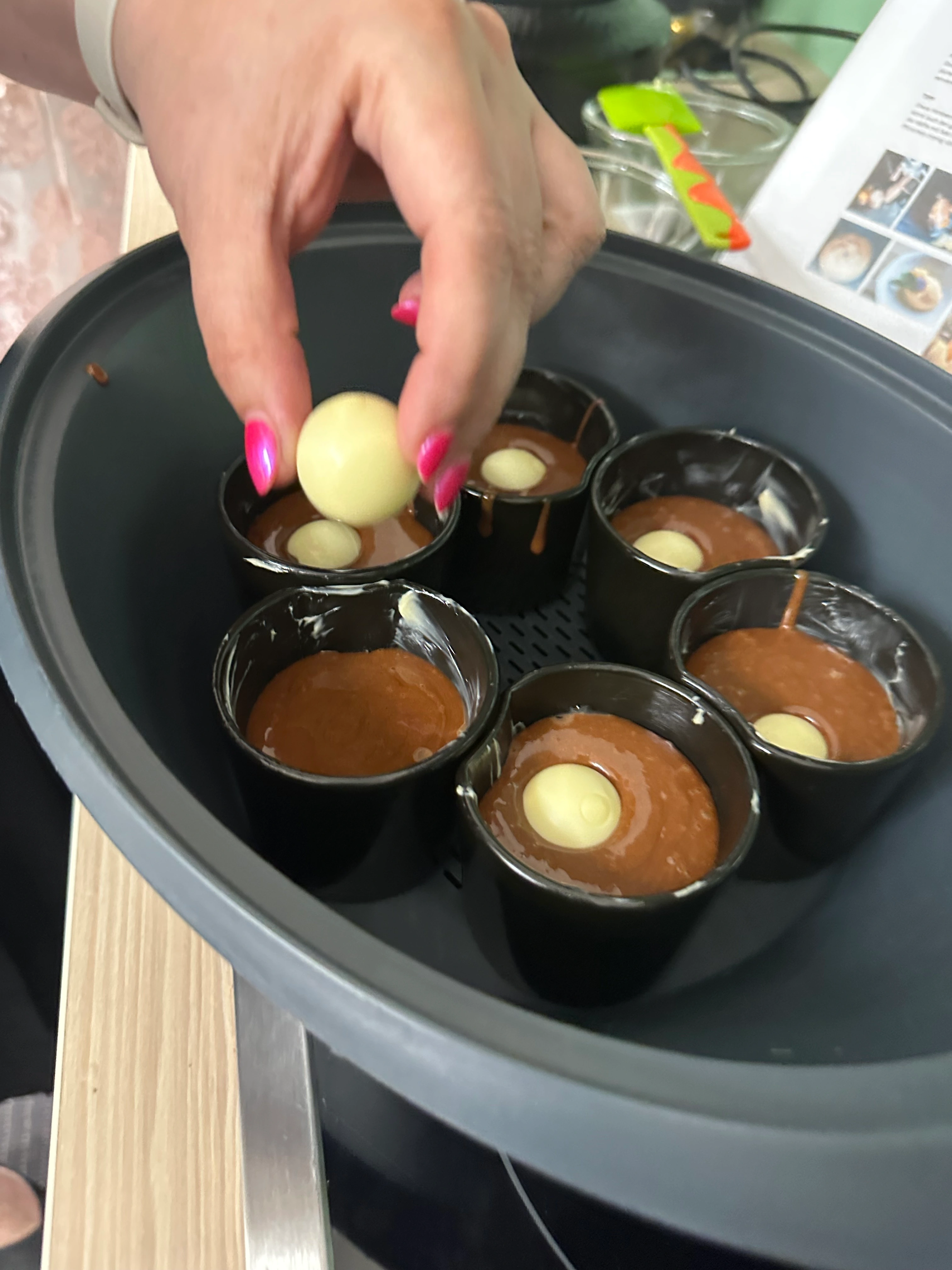 In der Mitte je Förmchen ein Stück weiße Schokolade geben und in den Varoma-Behälter stellen.